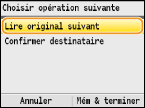 Si d'autres pages du document doivent être numérisées, placez la page suivante contre la vitre d'exposition, sélectionnez <Lire original suivant> et appuyez sur