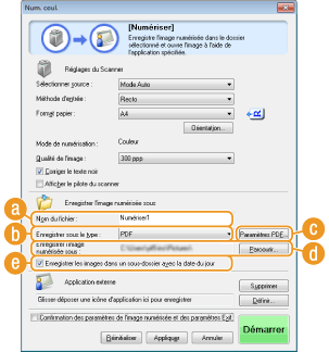 ), [Créer un fichier PDF selon] s'affiche à la place de [Enregistrer l'image numérisée sous]. Dans ce cas, spécifiez un fichier PDF auquel vous voulez ajouter les données du document qui vient d'être numérisé. Les données sont ajoutées au fichier existant sous forme de pages supplémentaires (Ajout de pages à un fichier PDF existant).