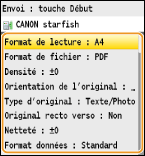Vous pouvez choisir <PDF>, <PDF (Compact)>, <TIFF> ou <JPEG> comme format de fichier.