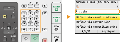 Servez-vous des touches numériques seulement si vous indiquez le premier destinataire. Pour choisir d'autres destinataires, utilisez le carnet d'adresses ou un serveur LDAP. Vous devez choisir les destinataires des adresses CC ou CCI dans le carnet d'adresses.