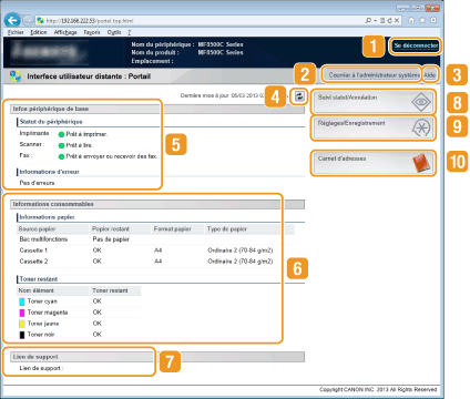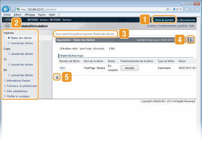 Affiche l'état des documents d'impression courants ainsi que l'historique des documents imprimés, envoyés ou reçus. Vous pouvez également examiner l'état de l'appareil.