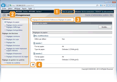 Affiche la page [Réglages/Enregistrement]. Lorsque vous êtes connecté en tant qu'administrateur système, vous pouvez modifier les valeurs des réglages et enregistrer/charger les données mémorisées.