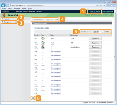 Affiche les numéros de composition codée et la liste des favoris mémorisés dans le carnet d'adresses. Vous pouvez également mémoriser/modifier le carnet d'adresses lorsque vous êtes connecté en tant qu'administrateur système.