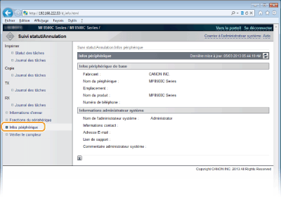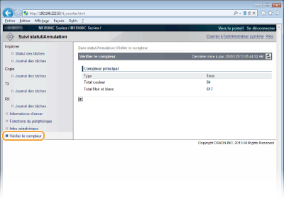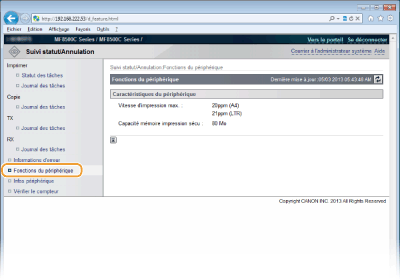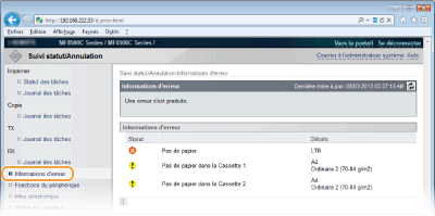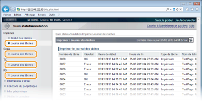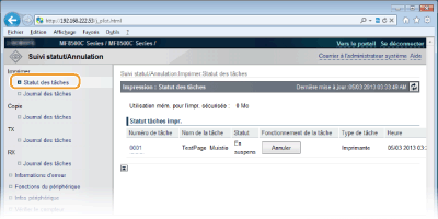Cliquez sur [Numéro de tâche] pour les documents dont l'impression est suspendue et les documents sécurisés pour afficher leurs informations détaillées. Vous pouvez vérifier le nom de l'utilisateur et le nombre de pages sur le document imprimé.