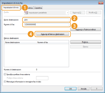Nella scheda [Impostazioni di invio], immettere [Nome destinazione] e [Numero di fax], quindi fare clic su [Aggiungi all'elenco destinazioni].
