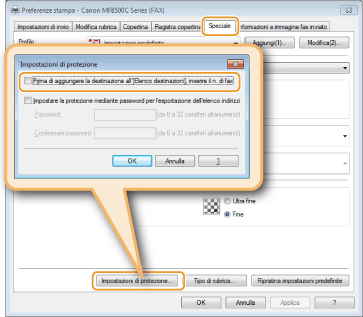 Se è stato selezionato [Prima di aggiungere la destinazione all'[Elenco destinazioni], inserire il n. di fax] nella finestra di dialogo visualizzata dopo aver fatto clic su [Impostazioni di protezione] nella scheda [Speciale], viene visualizzata una finestra di dialogo per la reimmissione del numero di fax quando si fa clic su [Aggiungi all'elenco destinazioni]. Per ulteriori informazioni, fare clic su [?] nella schermata del driver fax.