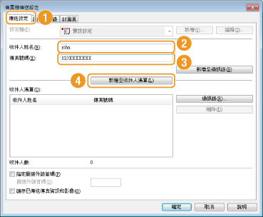 在 [傳送設定] 標籤上輸入 [收件人姓名] 和 [傳真號碼],然後按一下 [新增至收件人清單]。
