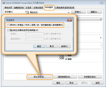 若在按一下 [特殊選項] 標籤的 [安全設定] 顯示的對話方塊中選擇 [將收件人新增至 [收件人清單] 前,請先重新輸入傳真號碼],則按一下 [新增至收件人清單] 時會再次顯示輸入傳真號碼的對話方塊。有關詳細資訊,請按一下傳真驅動程式畫面上的 [說明]。