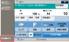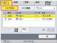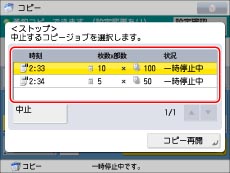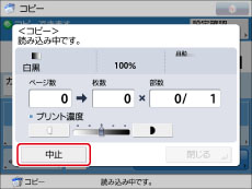 コピー中、または待機中に表示される画面の[中止]を押すと、コピー中のジョブや一番最後に原稿を読み込んだ待機中ジョブを中止できます。