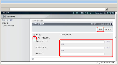 [パスワードを変更する]にチェックマークを付ける→パスワード情報を入力→[更新]をクリック