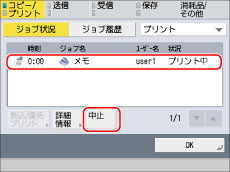 プリントを中止したジョブはプリントジョブ履歴の画面で「NG」と表示されます。