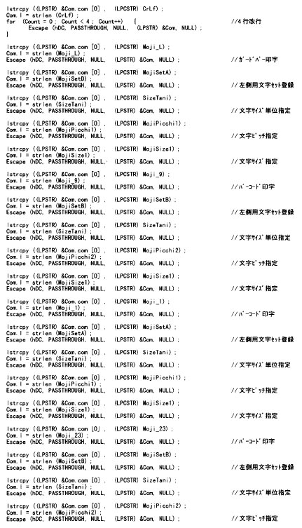 LIPSモードで、文字コードの置換による方法でJAN13桁のバーコードとOCR_B文字でコード番号を印刷する場合。(メインプログラムは「VC++用共通サンプルメインプログラム」を参照)