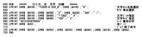 LIPSモードで、文字セットの切り換えによる方法でJAN13桁のバーコードとOCR_B文字でコード番号を印刷する場合。(メインプログラムは「VC++用共通サンプルメインプログラム」を参照)