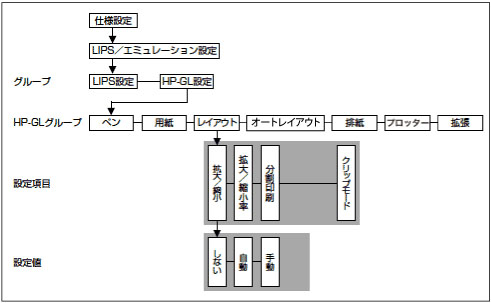 HP-GLエミュレーションモードの印刷環境の設定項目や設定値は、この中のHP-GLグループに含まれています。「HP-GL設定」というグループ階層を選択すると、HP-GLエミュレーションモード専用の6種類のメニューグループが表示されます。