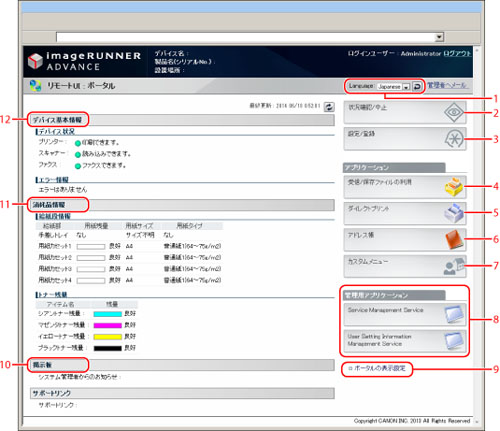 本製品の各種設定を設定/変更できます。一般ユーザーでログインした場合と管理者でログインした場合では、設定/変更できる項目が異なります。(→管理者の設定可能項目一覧(リモートUI)、本製品における管理者設定について)
