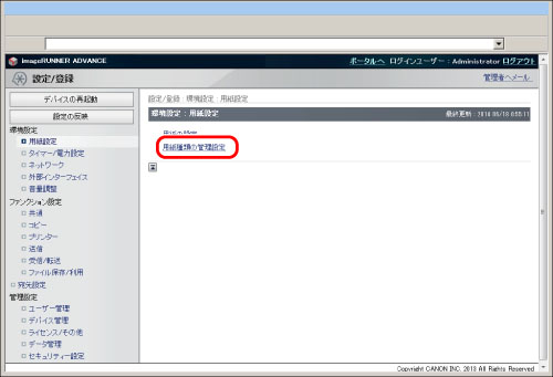 [設定/登録]をクリック→<環境設定>の[用紙設定]を選択→[用紙種類の管理設定]をクリック