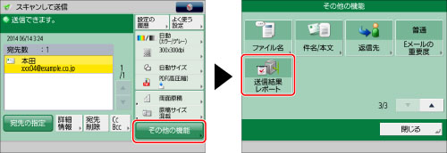 宛先を指定→[その他の機能]→[送信結果レポート]を押す