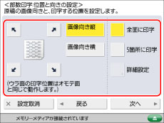 [部数印字拡張の設定]で<部数印字拡張>を「ON」に設定しているときは、印字位置の[全面に印字]、[5箇所に印字]を選択することはできません。(→部数印字拡張を設定する)