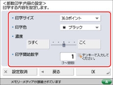 [部数印字拡張の設定]で、<部数印字拡張>を「ON」に設定しているときは、印字サイズが、[10.5ポイント]、[12.0ポイント]、[14.0ポイント]となります。(→部数印字拡張を設定する)