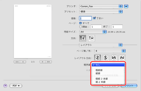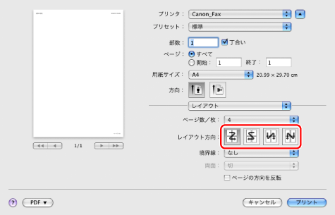 お使いのファクス→[レイアウト]→[ページ数/枚]から用紙1枚に配置するページ数を選択