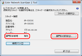 スキャン開始前に、認証情報を確認するダイアログボックスを表示させます。スキャナー本体で登録されている部門IDと暗証番号を入力すると、スキャンを開始します。