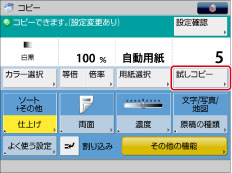 試しコピーは、[ソート(1部ごと)]、[シフト(ずらし)]、[90度回転]、[ホチキス]、[表紙]、[挿入紙]、[製本]、[OHP中差し]で複数部コピーを設定したときに表示されます。