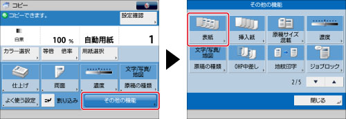 表紙、裏表紙で[オモテにプリントする]、[ウラにプリントする]または[両面にプリントする]を選択すると、手順3で選択した用紙カセットから用紙が給紙され、表紙、裏表紙として用紙のオモテ、ウラまたは両面にコピーされます。