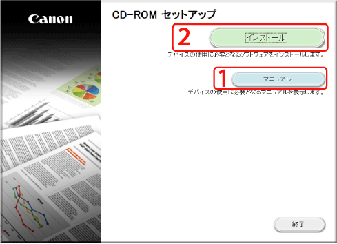 「ファクスドライバーインストールガイド」を参照するとき、最初にクリックします。インストール開始後は、インストールガイドを表示できません。