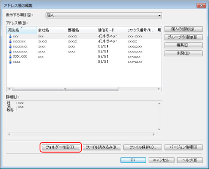 [アドレス帳の編集]ダイアログボックスで、[フォルダー指定]をクリック