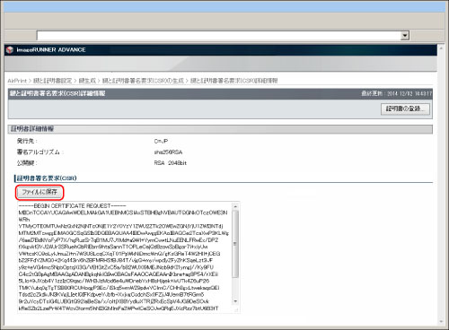 本体内で生成した鍵ペアの公開鍵に対して、認証局へ証明書署名要求(CSR:certificate signing request)をすることができます。証明書署名要求とは、公開鍵が正しいものであることを証明する公開鍵証明書の発行を求めるものです。生成された公開鍵証明書を本体に登録し、使用することができます。