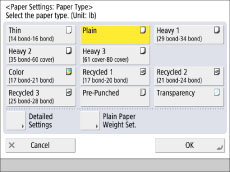 If you select [Plain], select the paper weight from [Plain Paper Weight Set.].