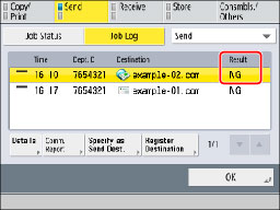 You can confirm the delivery status of the document in [Status Monitor/Cancel] → [Send] → [Job Log]. If the document was received successfully, [OK] will be displayed, if it failed to send, [NG] will be displayed, and if the results cannot be confirmed, <--> will be displayed. In the Simple mode, delivery confirmation is disabled. Even if the delivery was successful, <--> will be displayed. However, if [Restrict Access to Other User Jobs] in [Management Settings] (Settings/Registration) is set to 'On', jobs sent by other users are displayed as asterisks ('********'), and they cannot be checked. If you are logged in as the Administrator, jobs for all users are displayed.