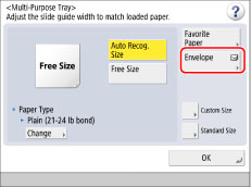 If a paper size other than envelopes is registered in [Multi-Purpose Tray Defaults] in [Preferences] (Settings/Registration), select [Standard] for [Always Specify].