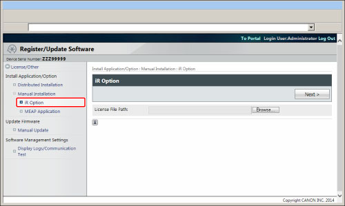 From the portal page of the Remote UI, click [Settings/Registration] → [License/Other] → [Register/Update Software].