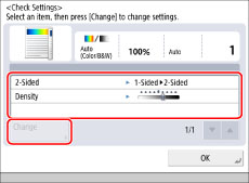 You can use the Setting Confirmation screen to confirm, change, or cancel selected copy modes.