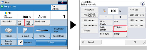 If you set the copy (zoom) ratio in [XY Ratio], the image of the original may be rotated before being printed. The machine calculates whether or not to do this based on the original size and the specified copy (zoom) ratio.