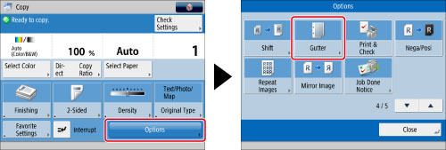 [Gutter] shifts the entire original image by the designated width. Therefore, an original whose image extends all the way to the edges of the sheet may be partially cut off on the copy.