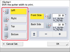 1-Sided 2-Sided: Set the Gutter mode for both the front side and back side.2-Sided 2-Sided: Set the Gutter mode for both the front side and back side.2-Sided 1-Sided: Set the Gutter mode for both the front side and back side. |