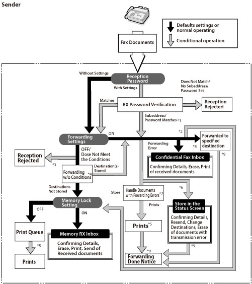*1 If the subaddress and password attached to the received document match the information registered in [Forwarding Settings], the documents are forwarded to their forwarding destinations regardless of the receive password setting.