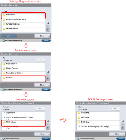 (Settings/Registration) on the control panel → log in as a user with the required privileges using the touch panel display. For more information, see "Setting Administrators."Specify the settings in [Network] in [Preferences] to suit your network environment. The following screen shots show the flow of operations for specifying the network settings.