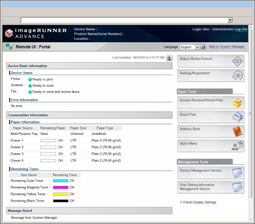 Message Board: Displays messages from the administrator on the touch panel display and Remote UI. (See "Setting Administrators.")