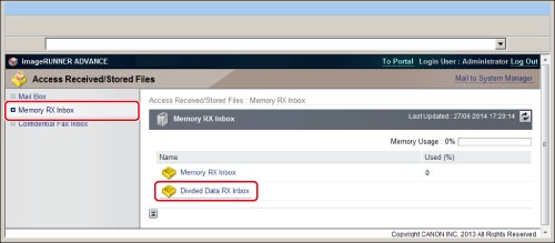 Click [Access Received/Stored Files] → [Memory RX Inbox] → [Divided Data RX Inbox].