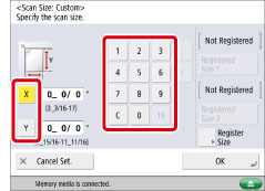 Press [X] or [Y] → enter the scan size in inch → press [OK].