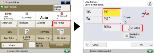 Press [File Format] → select [PDF] or [XPS] → press [Set Details].