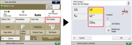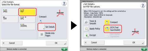 If you select [PDF] as the file format, you can set [Compact] and [OCR (Text Searchable)] at the same time.