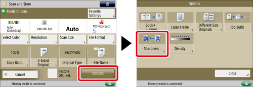 If you are using the Advanced Space of another machine on the network or memory media, the setting for [Sharpness] is invalid when all of the conditions below are met. The setting is reflected in the image displayed for [Display Image], but not for the actual scanned image.