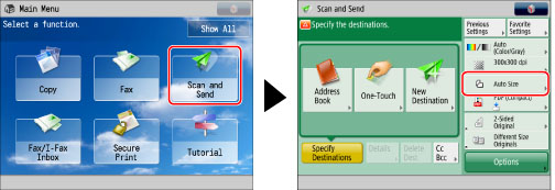 Press [Scan and Send] → specify the destination → press the scan size button.