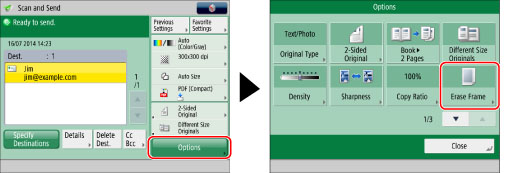 This mode enables you to remove the shadows and lines that appear when scanning various types of originals. There are three types of Erase Frame: [Erase Original Frame], [Erase Book Frame], and [Erase Binding].
