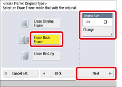 You can set the Erase Book Frame mode only for the original paper sizes shown on the touch panel display.