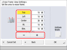 Specify the location of the binding holes → press [-] or [+] to set their respective erase frame widths.